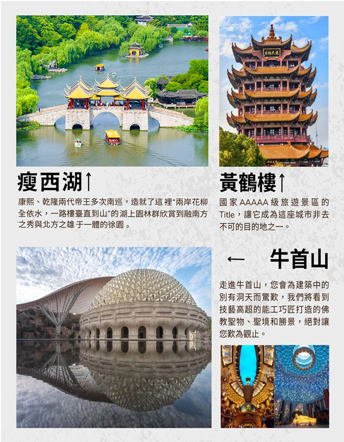 【黃鶴樓】遊輪順流而下,抵達武漢港。今天的第一站,我們乘車前往大名鼎鼎的“天下江山第一樓”黃鶴樓。去看一看激發崔顥、李白、王維、嶽飛和毛澤東等歷代文人墨客,登樓題詩作文的豪情和靈感來自哪裡?是樓宇八方飛簷的縹緲鶴翼,是在樓頂瞭望長江穿城而過的浩瀚,還是環樓俯瞰江城而生的凜然氣概。踏進黃鶴樓,我們將在這裡找到答案。