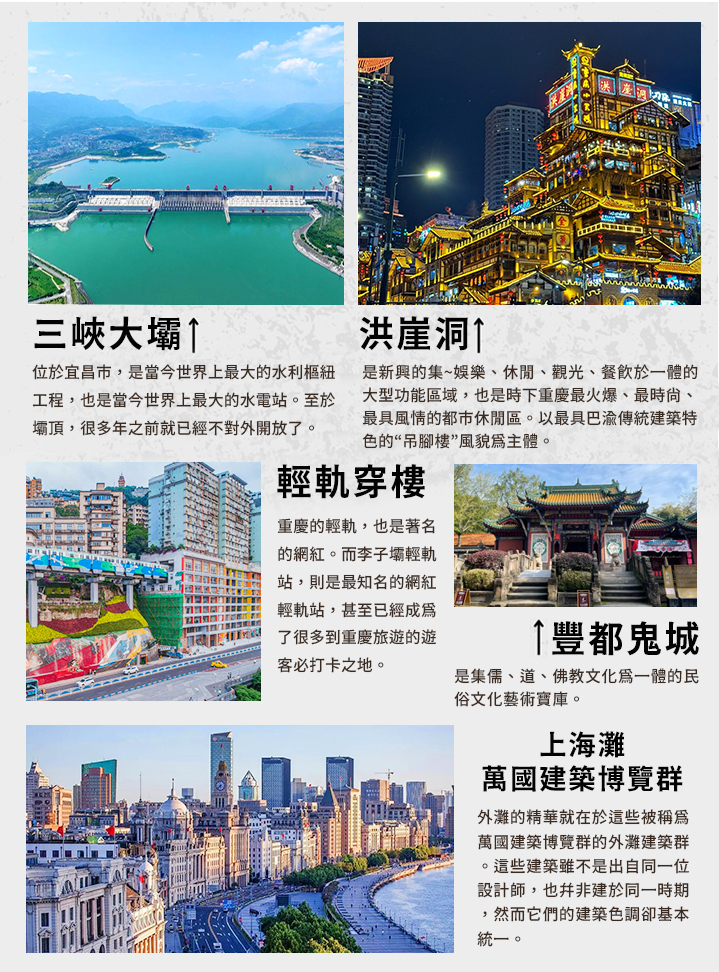 今天在機場集合辦理登機手續後,搭乘班機飛往有「霧都」之稱-重慶。重慶被長江和嘉陵江環抱,有『山城、江城』之稱。每當夜幕降臨,重慶城區裡的萬家燈火與水色天光交相輝映,燦若星河,成為迷人的-山城夜景。