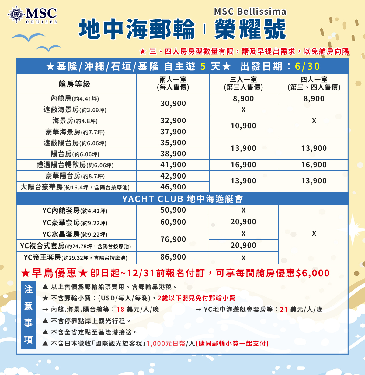 ● 以上售價為郵輪船票費用、含郵輪靠港稅。