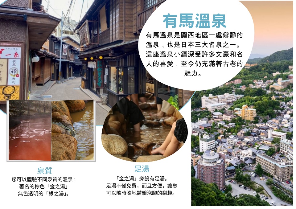 【有馬溫泉】有馬溫泉為關西最古老和最著名的溫泉鄉,同時與愛媛縣的道後溫泉、和歌山縣南紀白濱溫泉並稱日本三大古湯;又與群馬縣的草津溫泉、歧阜縣的下呂溫泉並稱日本三大名泉。有馬溫泉的地質環境特殊,與一般火山地形的溫泉不一樣,這裡附近沒有火山地形,但溫泉卻可以從地底下60公里處湧出,且有多種泉質,包含了低溫的碳酸冷礦泉以及98度的高溫泉,在日本及世界都是少見的現象。