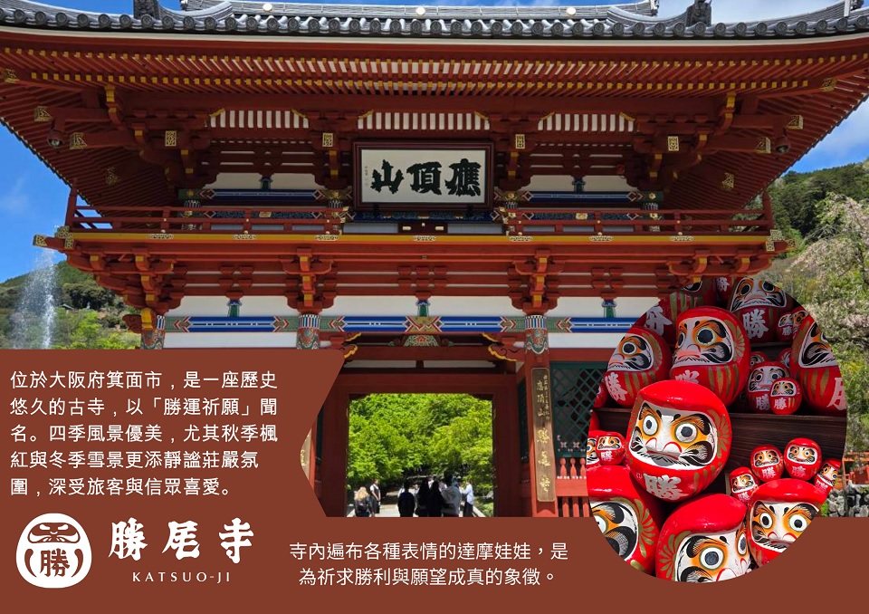 【勝尾寺】位於大阪箕面市的「勝尾寺」,以境內遍佈的「達摩不倒翁」而聞名,也被尊崇為祈求勝利和吉祥的寺廟。對於祈求合格與勝利十分靈驗,不但是許多生意人和學子喜歡參拜的地方,自古以來更是將軍武士以及現今政治人物等渴求勝運之人的信仰中心。