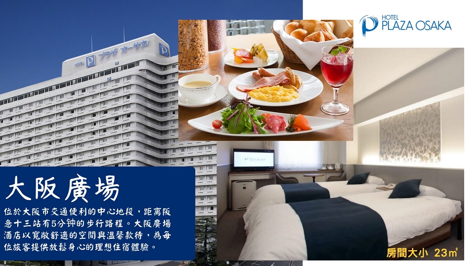 大阪難波萬楓酒店 或 MOXY大阪系列飯店 或 Holiday Inn Express 御堂筋 或 大阪廣場 或 大阪堺Agora Regency酒店 或 QUINTESSA大阪灣 或Dormy Inn飯店 或 大阪市區飯店 或 同級