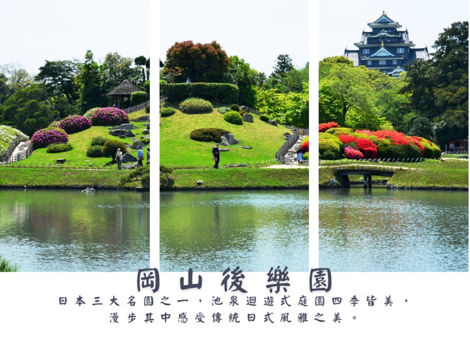 【岡山後樂園】已被列聯合國教科文組織的世界文化遺跡日本三大名園之一的觀光名所,後樂園與金澤『兼六園』、水戶『偕樂園』並稱日本三大名園。佔地十三萬平方公尺,為江戶時代岡山藩主池田綱政花費14年的時間於1700年完成,採借景法之池泉迴遊式庭園,整體的設計不僅只於鑑賞的功能也有修身、待客、武術鍛鍊等用途,庭中有田園、茶田、梅林等,而庭園中心的澤之池可眺望備前富士以及岡山城,視野堪稱一絕。