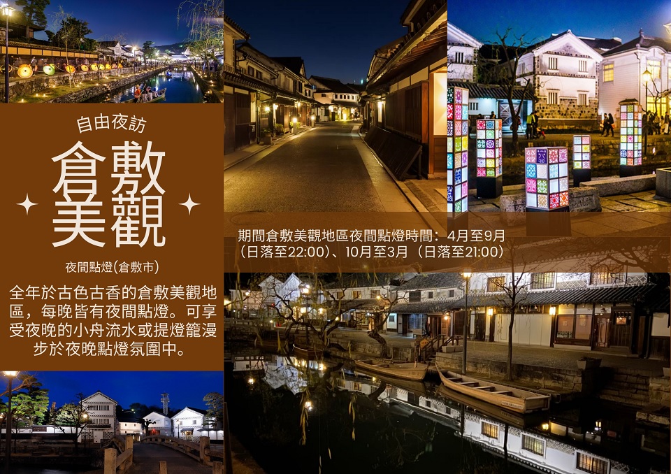【倉敷美觀地區】保存著日本江戶時期直轄地盛極一時的繁榮情景,一街一景都有著樸實的風味。流過整個倉敷美觀地區的倉敷川是1條由石垣砌成的河道,其中有10座青石拱橋跨越兩岸。漫步在古意盎然的純樸街道中,沿途可以欣賞商人們用於貯存貨物的白色牆壁的倉庫,至今尚保存著的貨場、大八車(過去運送物資的車)通行的石板路、相當於古時的路燈的常明燈等等,反映出當時的繁榮景象。