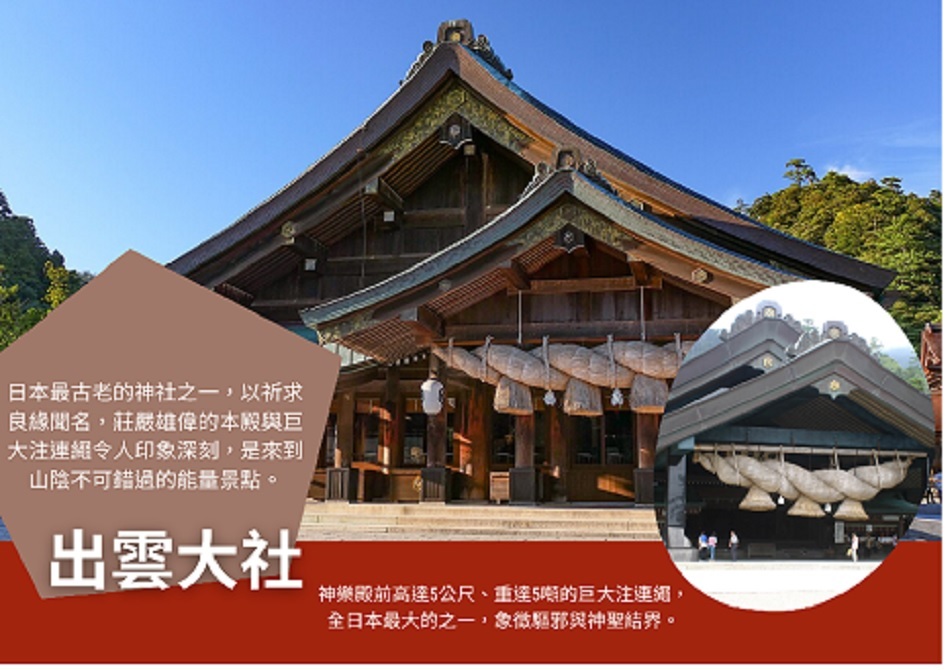 【出雲大社】已有八百年歷史,佔地18萬平方公尺,以「結緣之神」和「福神」而香火鼎盛。出雲大社的建築風格為日本古老的神殿建築樣式,以祭祀大國主命之本殿的神樂殿為中心,其側拜殿並立,四處散發出神聖的氛圍,卻又有一種讓人意外的寬闊舒適之感。