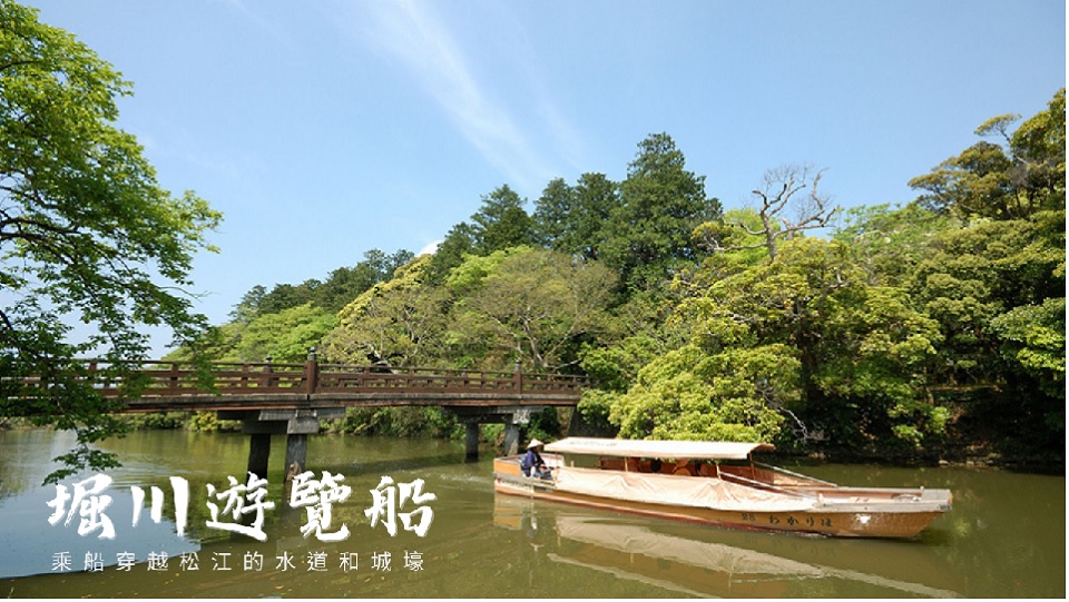 【崛川遊船】搭乘堀川遊船遊覽松江城,感受松江築城400年的歷史情懷,河岸旁的垂柳、唐菖浦花倒映在墨綠色的川面上景致優雅,岸邊的住家妝點襯托著沿岸景色。船伕經常是一邊吟唱著傳統歌謠,一邊為大家介紹沿岸風光。堀川上有16座各具特色的橋,其中有4座橋的橋墩很低,需搖下船篷才能通行,這時船伕會要求大家把身子往後躺,一趟船行下來,就這樣趴趴躺躺了好幾次,真是別有一番情趣!