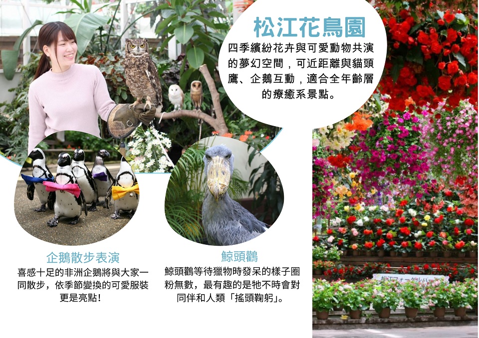 【松江花鳥園】位於美麗的宍道湖湖畔,是鳥語花香的天堂,公園周圍的步道完全被屋頂覆蓋,無論晴天還是雨天,都為遊客帶來無限樂趣。他們擁有日本最大的花卉溫室之一。溫室內以秋海棠和倒掛金鐘為主,約有10,000株花卉全年盛開。在鳥類區,遊客可以看到 90 個品種 400 隻鳥類,例如稀有的貓頭鷹、可愛的企鵝和其他色彩鮮豔的熱帶鳥類。