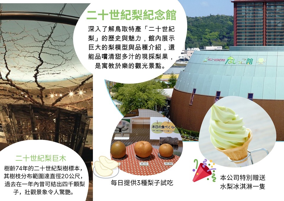 【二十世紀梨紀念館】是日本唯一以梨子為主題的博物館。有關於梨子的歷史和產業情報的介紹,也有探索和體驗樂趣的展示和企劃。樹枝廣為20公尺的二十世紀梨巨木作為鳥取二十世紀梨紀念館的象徵,收集著世界的梨品種,全年都可試吃到3種不同種類的梨子,能夠於此地享受一整天的樂趣。並設的休息室內,也可以享用「梨子霜淇淋」。