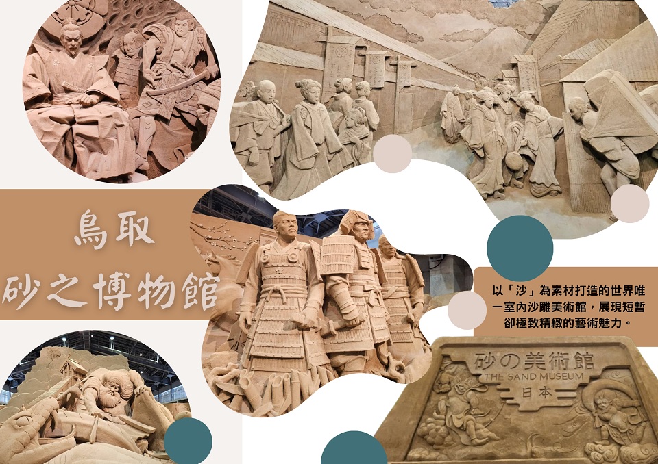 【砂之美術館】位於鳥取砂丘的世界唯一使用「沙」做為雕刻作品素材的室內美術館,於2012年4月盛大開幕。連細節部分也精心雕刻的沙像,因隨時間變化有易崩毀的特性,觀賞場所和時間也被限定。這樣的無可取代性,也是沙雕之所以美麗且深具魅力的地方。從館內設有玻璃的場所和屋外廣場可眺望鳥取砂丘。