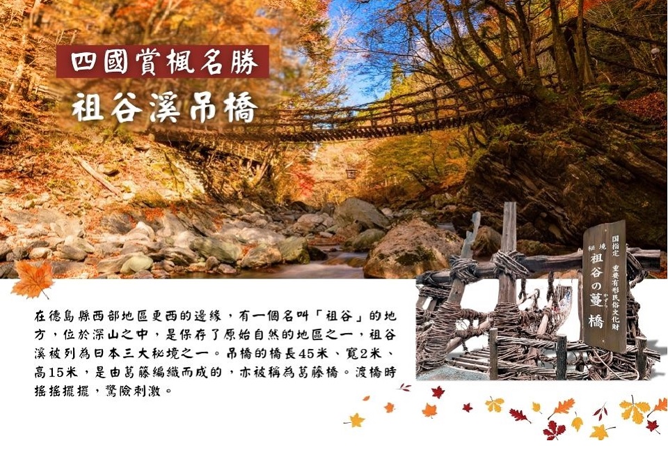 【祖谷溪吊橋】蔓藤橋是從秘境奧祖谷中長出來藤蔓編織而成的橋,為日本三大奇橋之一。據說是800年前,由當地最大勢力的平家為訓練馬匹所架設。