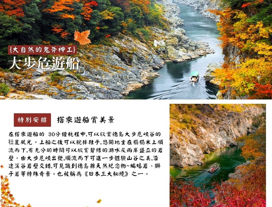 【大步危溪谷遊船】在搭乘遊船的 30 分鐘航程中,可以欣賞德島大步危峽谷的壯麗風光。上船之後可以脫掉鞋子,悠閒地坐在榻榻米上順流而下,有充分的時間可以欣賞碧綠的湖水及兩岸聳立的岩壁。由大步危峽出發,順流而下可進一步體驗山谷之美,沿途溪谷岩壁交錯,可見識到德島縣天然紀念物~蝙蝠岩、獅子岩等特殊奇景。也被稱為《日本三大祕境》之一。