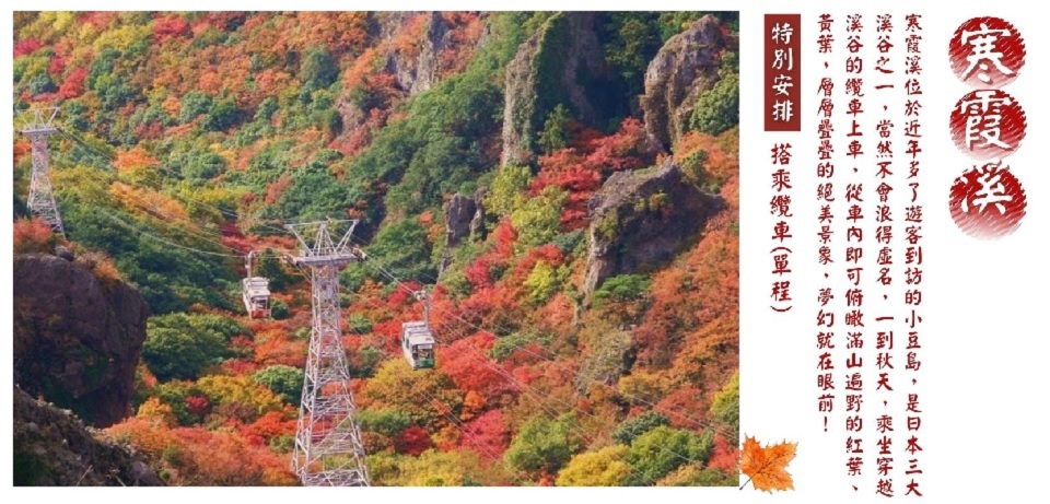 【寒霞溪】日本三大絕美溪谷之一的寒霞溪,是代表瀨戶內海國立公園的名勝地。在這裡可觀賞到春季的新綠、夏季的深綠、秋季的紅葉、冬季的雪景,四季變化的表情,還可遠眺瀨戶內海。而各式各樣的奇岩怪石也是必看的景點,這是1300萬年前火山活動而形成的岩塊,因長年累月的地殼變動及風化、侵蝕,形成地質學上別有趣味的絕景。去程搭乘巴士到紅雲亭站,轉乘纜車來個空中散步,回程以健行方式回來,也是個不錯的安排。一路上有許多野生植物,邊走邊欣賞,感受季節的美好。