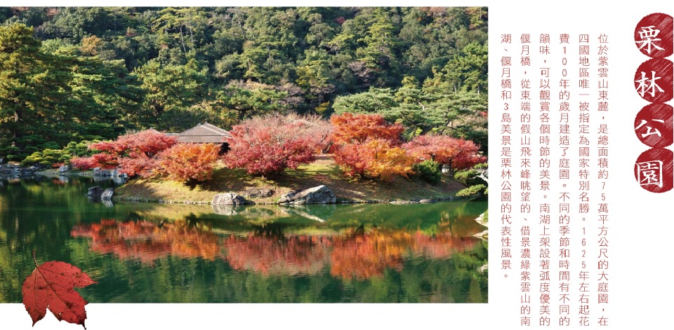 【栗林公園】在園林文化遺産中,有國家指定的特別名勝。其中,栗林公園最大。它以深綠色的紫雲山爲背景,巧妙地分布著六個水池和十三座假山。作爲江戶時代初期,以有著近四百年曆史著稱的環遊式大名園林,栗林公園有著優越的地域劃分,也有點景石,同時又富有木石的雅趣。栗林公園的春夏秋冬有著不同的風光。這裏有一千顆姿態優美的松樹,景象可以說是一步一個變化,非常美麗。栗林公園經曆了漫長的歲月,被人們所喜愛,一直留存到現在,如今已經成爲不可替代的文化遺産。