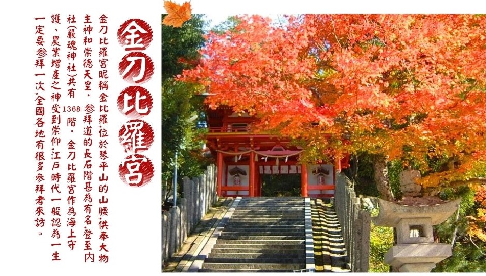 【金刀比羅宮】位於香川縣西部海拔521米的象頭山山腰上。這裏因供奉著被稱爲“金毘羅”的海上守護神而聞名,它有治療疾病、消災避禍、帶來好運的神明,因此自古以來一直香火興旺。在民間信仰高漲的14世紀室町時代,“參拜金毘羅”是很盛行的一項活動,現在仍有許多人從全國各地趕來參拜。參拜道路極長,到象頭山山腰的正宮爲785級石階,到奧社是1368級,站在正宮前可以一覽讚岐平原。