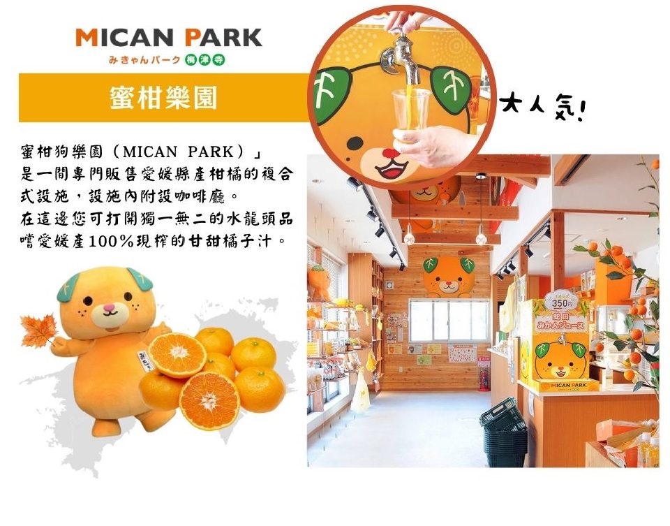 【MICAN PARK蜜柑樂園】為一複合設施,有生產加工愛媛蜜柑的工廠,以及可品嚐柑橘產品的咖啡店,最特別的是用手一轉開水龍頭,流出來的不是水是橘子汁!1樓為加工製造果汁和果凍的工廠,來訪的遊客們可透過透明玻璃看見加工製程。也有販售愛媛吉祥物蜜柑狗狗的各式產品。2樓則是以蜜柑狗狗家族為主題的咖啡店。可在店內各處找到蜜柑狗狗家族的蹤跡。