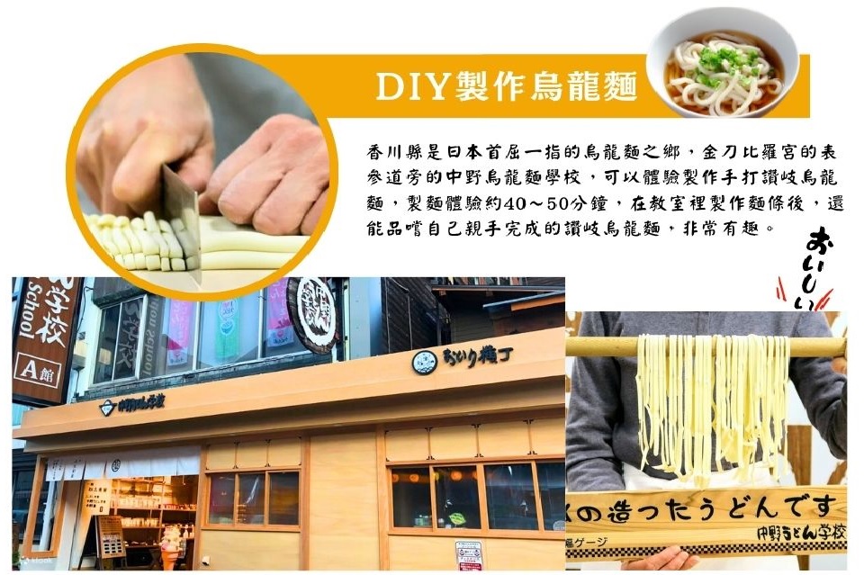 【烏龍學校DIY製作烏龍麵】香川縣是日本首屈一指的烏龍麵之鄉,在體驗活動中製作手打讚岐烏龍麵,只要跟著老師的指導教學,把麵粉揉成麵糰後,再經過踩踏麵糰、桿麵糰和切麵等步驟,就能製作出傳統的讚岐烏龍麵條。