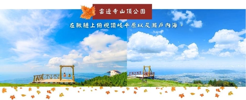 【雲邊寺纜車】從高空纜車山麓駅往上單程約7分鐘的空中漫步過程中,能一覽瀨戶內海絕景的名勝景點。以「天空的鞦韆」受歡迎的雲邊寺山頂公園則座落在標高920公尺的山頂上。山頂公園有能一面俯瞰讚岐平原和瀨戶內海,一面擺盪於空中的木製「天空的鞦韆」。也有能拍攝絕景的巨幅相框,以及各種色彩繽紛的可愛長凳!咖啡餐車則供應著美味點心飲料,可供休憩歇腳。這座公園不斷的推陳出新引起話題討論,旨在成為在地居民自豪的景點。